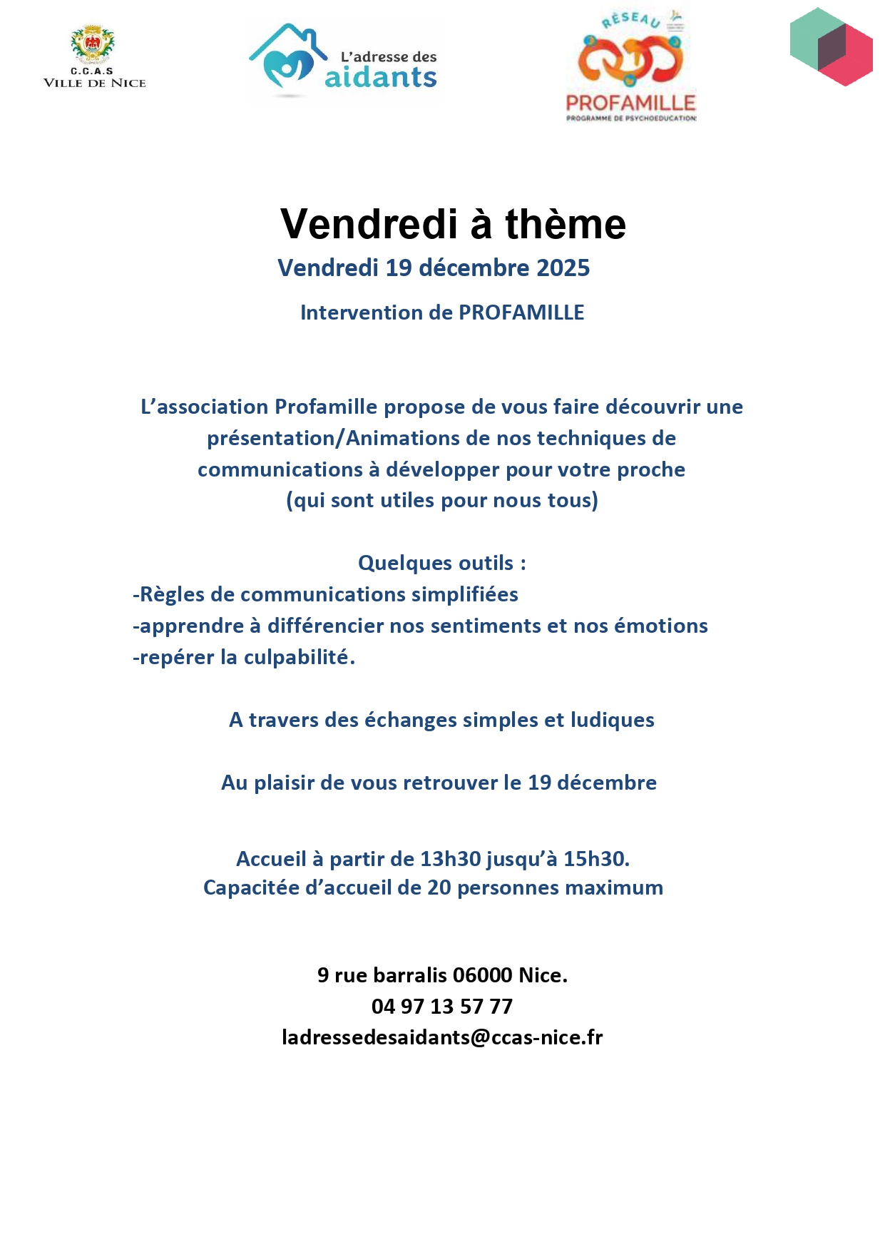Vendredi à thème - 19 décembre - PROFAMILLE " les techniques de communications à développer pour votre proche"